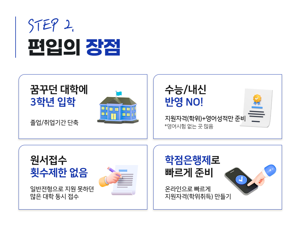 3. Á¦´ë·Î ¾Ë°í ÁغñÇÏÀÚ ÀÏ¹ÝÆíÀÔ VS ÇлçÆíÀÔ ¡ØÆíÀÔÀº °¢ ÀüÇü¿¡ ¸Â´Â Áö¿øÀÚ°ÝÀ» °®Ãß¾î¾ß ÇÕ´Ï´Ù. ÀÏ¹ÝÆíÀÔ Áö¿øÀÚ°Ý - 4³âÁ¦ ´ëÇб³¿¡¼­ 2Çг⠼ö·á - Àü¹®´ë Á¹¾÷ - ÇÐÁ¡ÀºÇàÁ¦ 70-80ÇÐÁ¡ À̼ö ÇлçÆíÀÔ Áö¿øÀÚ°Ý - 4³âÁ¦ ´ëÇб³ Á¹¾÷ - ÇÐÁ¡ÀºÇàÁ¦ ÇлçÇÐÀ§ Ãëµæ *Èñ¸ÁÇб³, Çаú, ÀüÇü, ÃÖÁ¾ÇзÂ, º¸À¯ÇÐÁ¡ µî ÇнÀÀÚÀÇ »óȲ°ú ¸ñÇ¥Áö¿ø½Ã±â¿¡ ¸Â´Â ¼Ö·ç¼Ç Á¦°ø *¿©±â½ºÅ͵ð 1:1 ÇнÀÇ÷¡³ÊÀÇ ÇлçÀÏÁ¤/ÇÐÁ¡°ü¸®