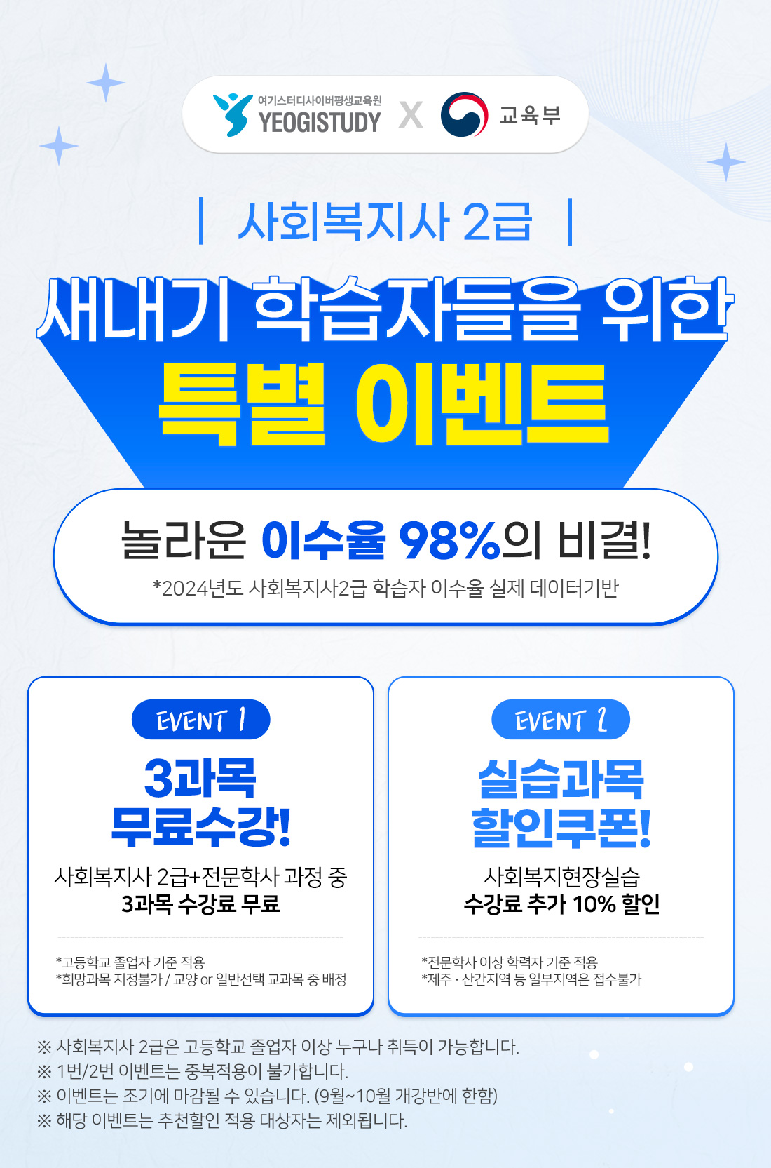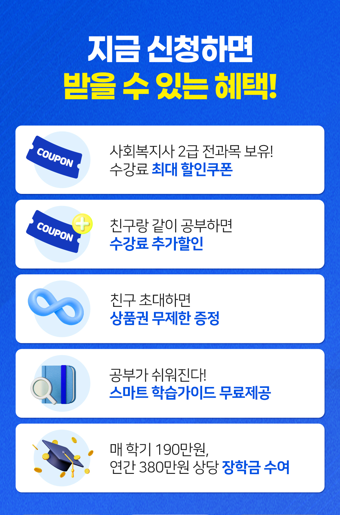 사회복지사 2급 전과목 보유! 수강료 최대 할인쿠폰 친구랑 같이 공부하면 수강료 추가할인 친구 초대하면 상품권 무제한 증정 과락없이 100% 한 번에 취득하는 비법서 무료증정 매 학기 190만원 연간 380만원 상당 장학금 수여