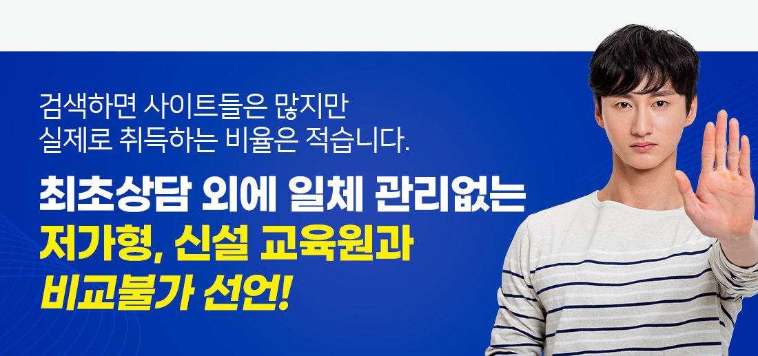 무분별한 광고글, 공격적인 온라인 호객행위 정말 믿으시겠습니까? 검색하면 사이트들은 많지만 실제로 취득하는 비율은 적습니다. 최초상담 외에 일체 관리없는 저가형, 신설 교육원과 비교불가 선언!