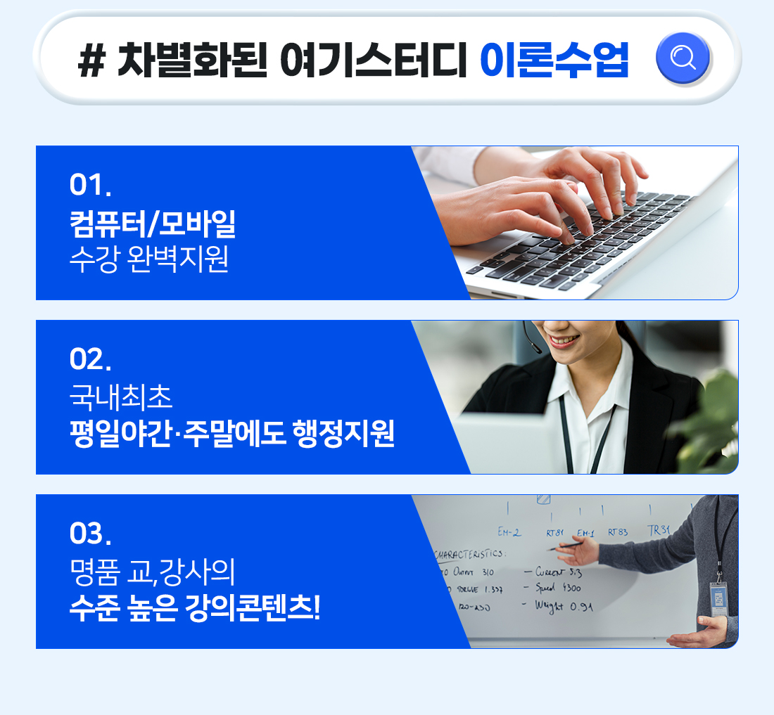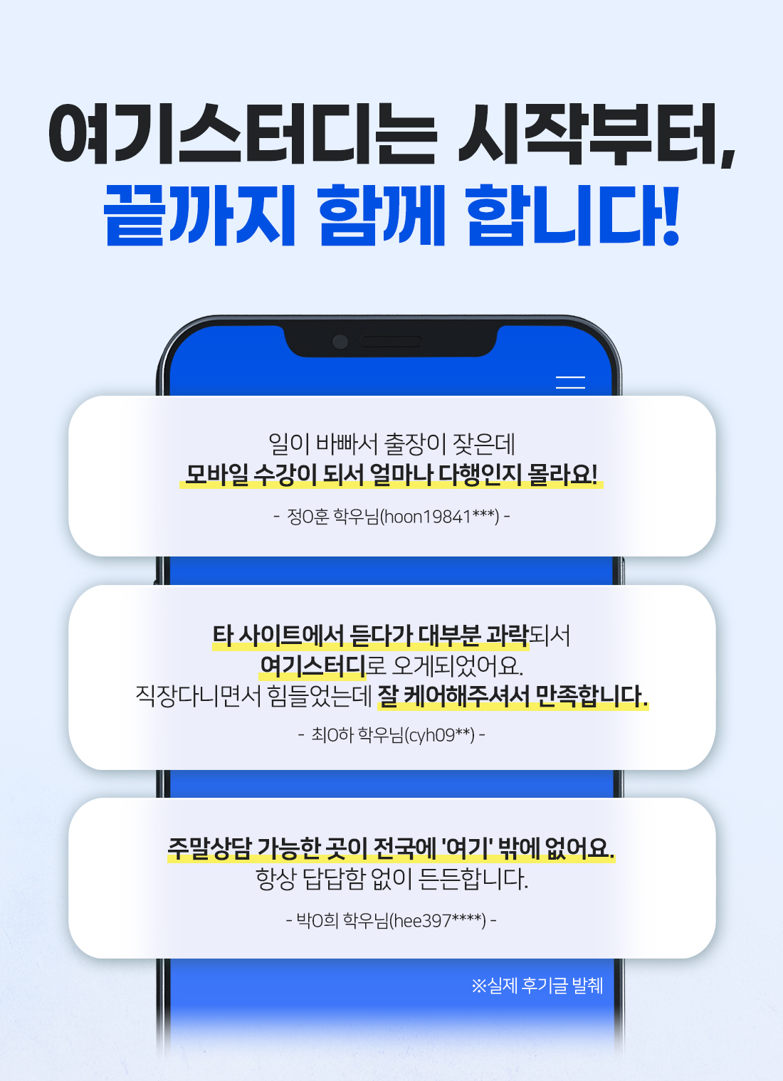 일이 바빠서 출장이 잦은데 모바일 수강이 되서 얼마나 다행인지 몰라요! -정O훈 학우님(hoon19841***)- 타 사이트에서 듣다가 대부분 과락되서 여기스터디로 오게되었어요. 직장다니면서 힘들었는데 잘 케어해주셔서 만족합니다. -최O하 학우님(cyh09**)- 주말상담 가능한 곳이 전국에 '여기'밖에 없어요. 항상 답답함 없이 든든합니다. -박O희 학우님(hee397****)- ※실제 후기글 발췌