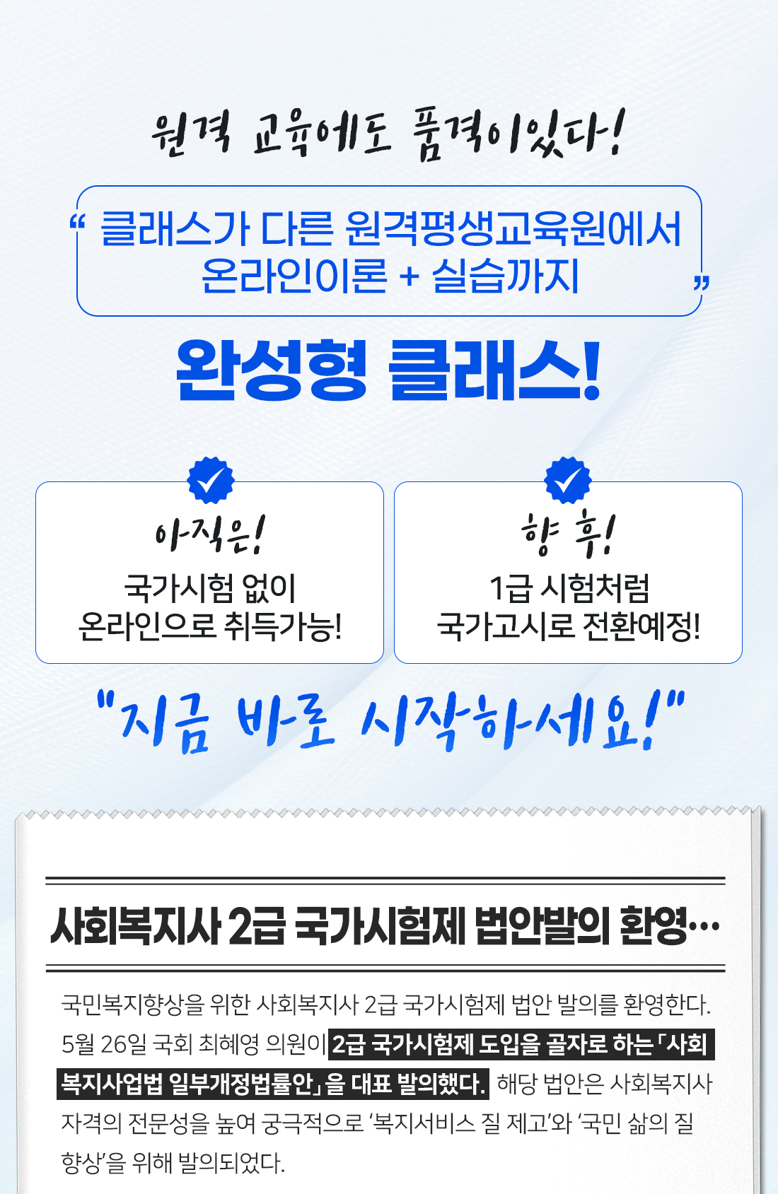 교육에도 품격이 있다! 클래스가 다른 평생교육원에서 온라인이론+실습까지 완성형 클래스! 아직은! 국가시험없이 온라인으로 취득 가능! 이제 곧! 1급 시험처럼 국가고시로 전환예정! 지금바로 시작하세요!