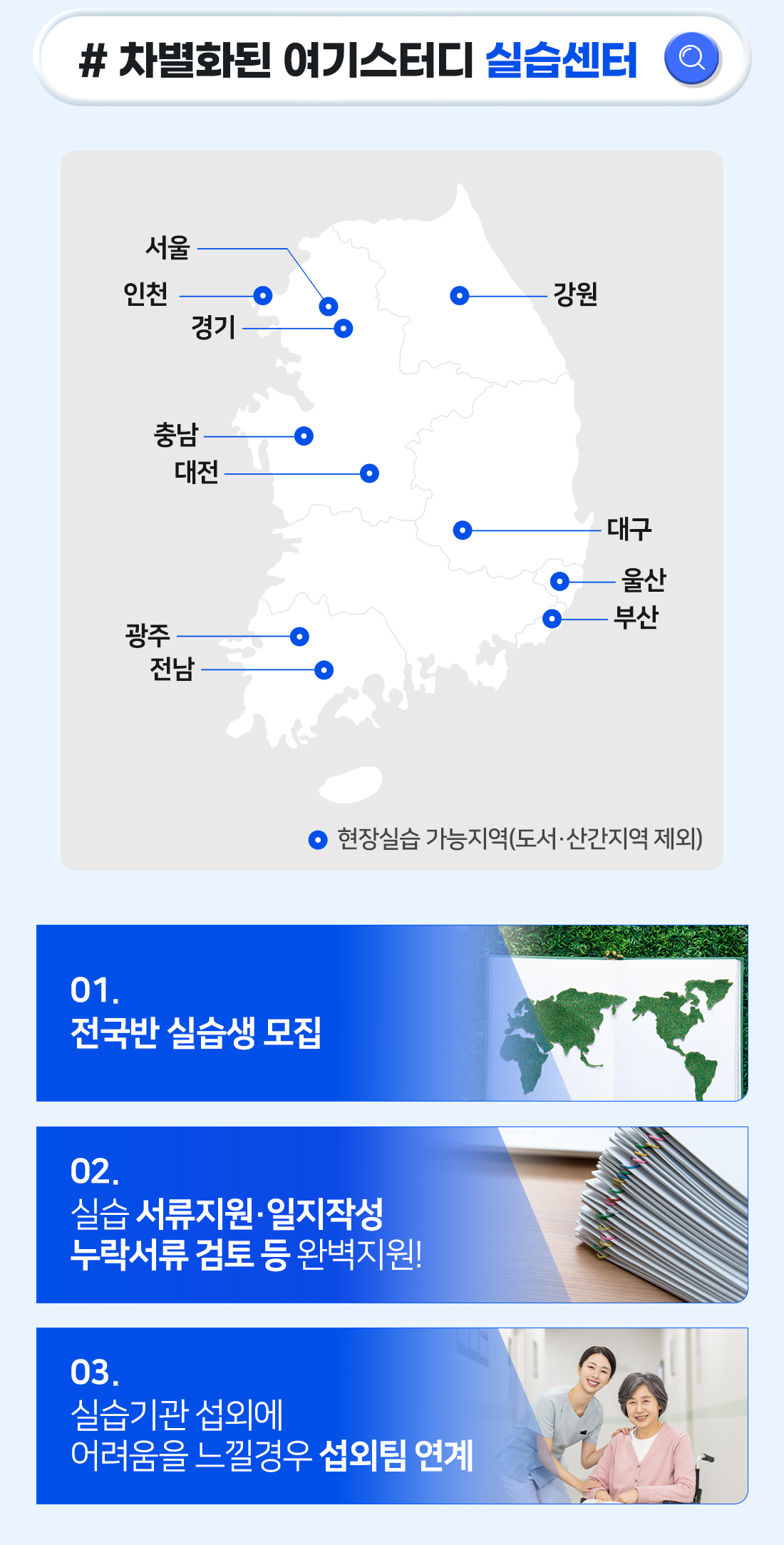 차별화된 여기스터디 이론수업 컴퓨터/모바일 수강 완벽지원 국내최초 평일야간/주말에도 행정지원 바쁜 현대인들을 위한 쉬운 과목수료 보장 차별화된 여기스터디 실습센터 전국반 실습생 모집 사회복지 현장실습 서류지원/일지작성/누락서류검토 완벽지원 실습기관 섭외에 어려움을 느낄경우 섭외팀 연계 검색하면 많은 사이트들은 많지만 실제로 취득하는 비육은 적습니다. 최초상담 외에 일체 관리없는 저가형, 신설 교육원과 비교불가 선언!