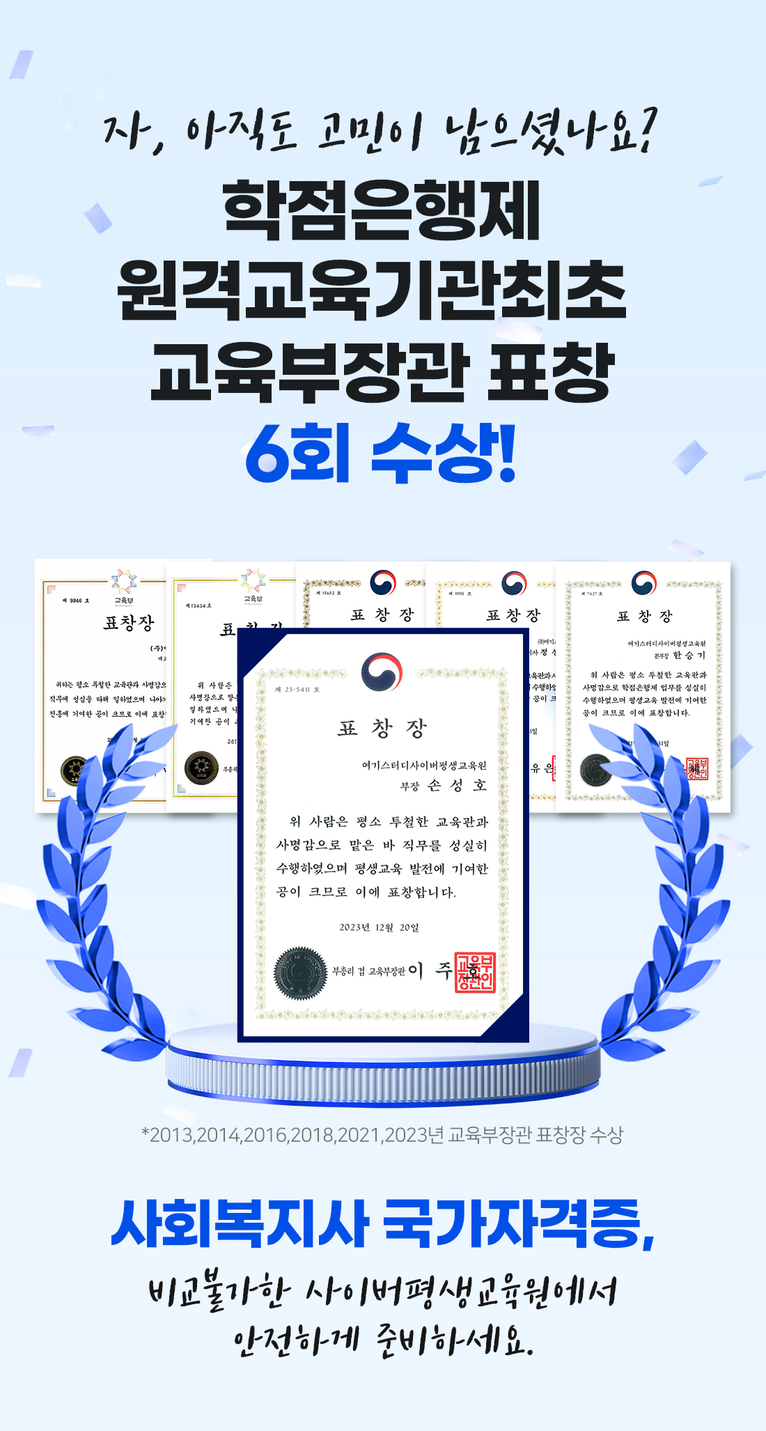 자, 아직도 고민이 남으셨나요? 학점은행제 원격교육기관 최초! 교육부장관표창 6관왕 달성! 사회복지사 국가자격증 비교불가한 명품 사이버평생교육원에서 안전하게 준비하세요