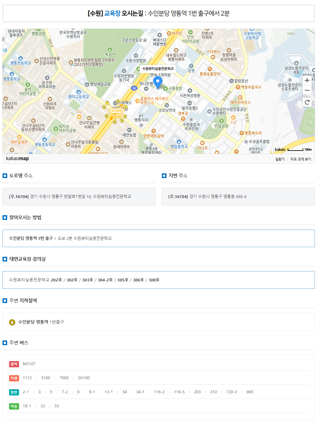 수인분당 영통역 1번 출구 > 도보 2분 수원뷰티실용전문학교
