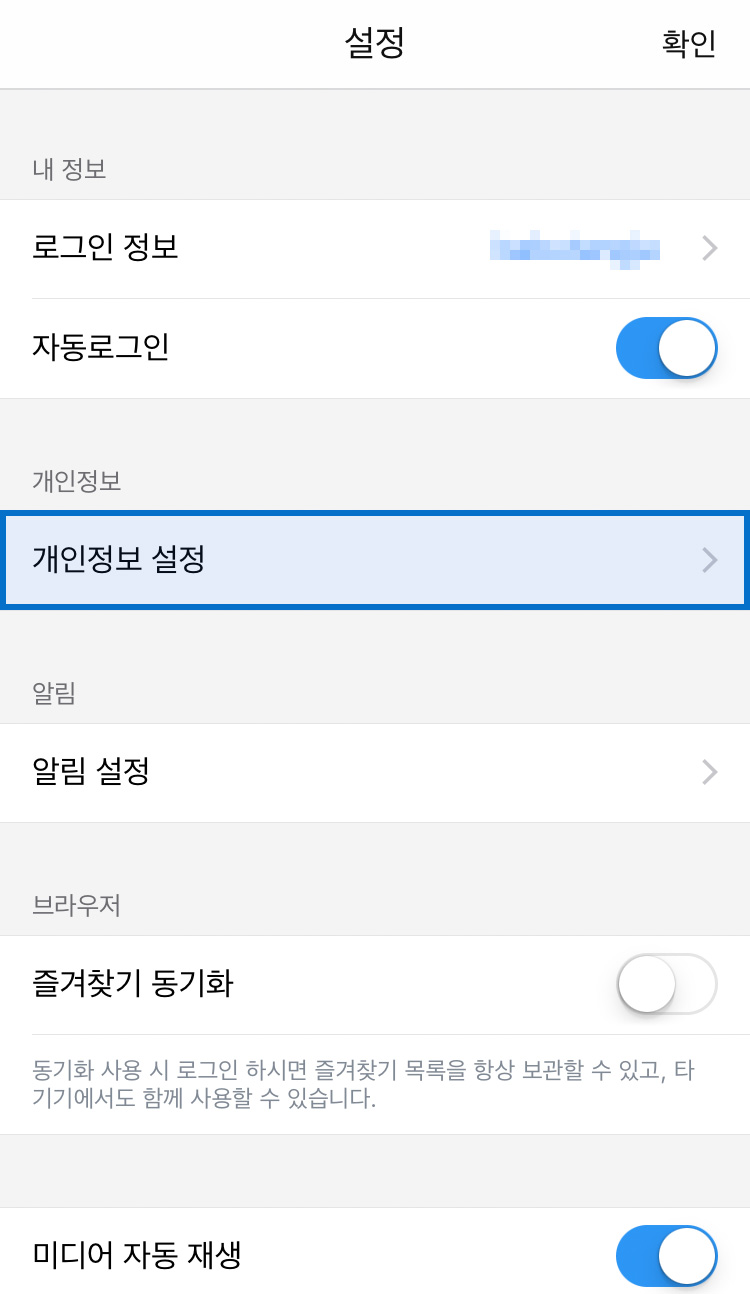 STEP 03. 설정 메뉴 중 [개인정보 설정] 메뉴 클릭