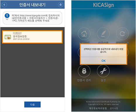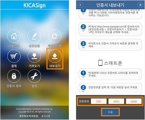 ¡Ø (ÁÖ)Çѱ¹Á¤º¸ÀÎÁõ KICASign+ APP ¿Ü ´Ù¸¥ ÀÎÁõ¼ APP¿¡¼´Â ³»º¸³»±â / °¡Á®¿À±â¸¦ ÇÏ½Ç ¼ö ¾ø½À´Ï´Ù.